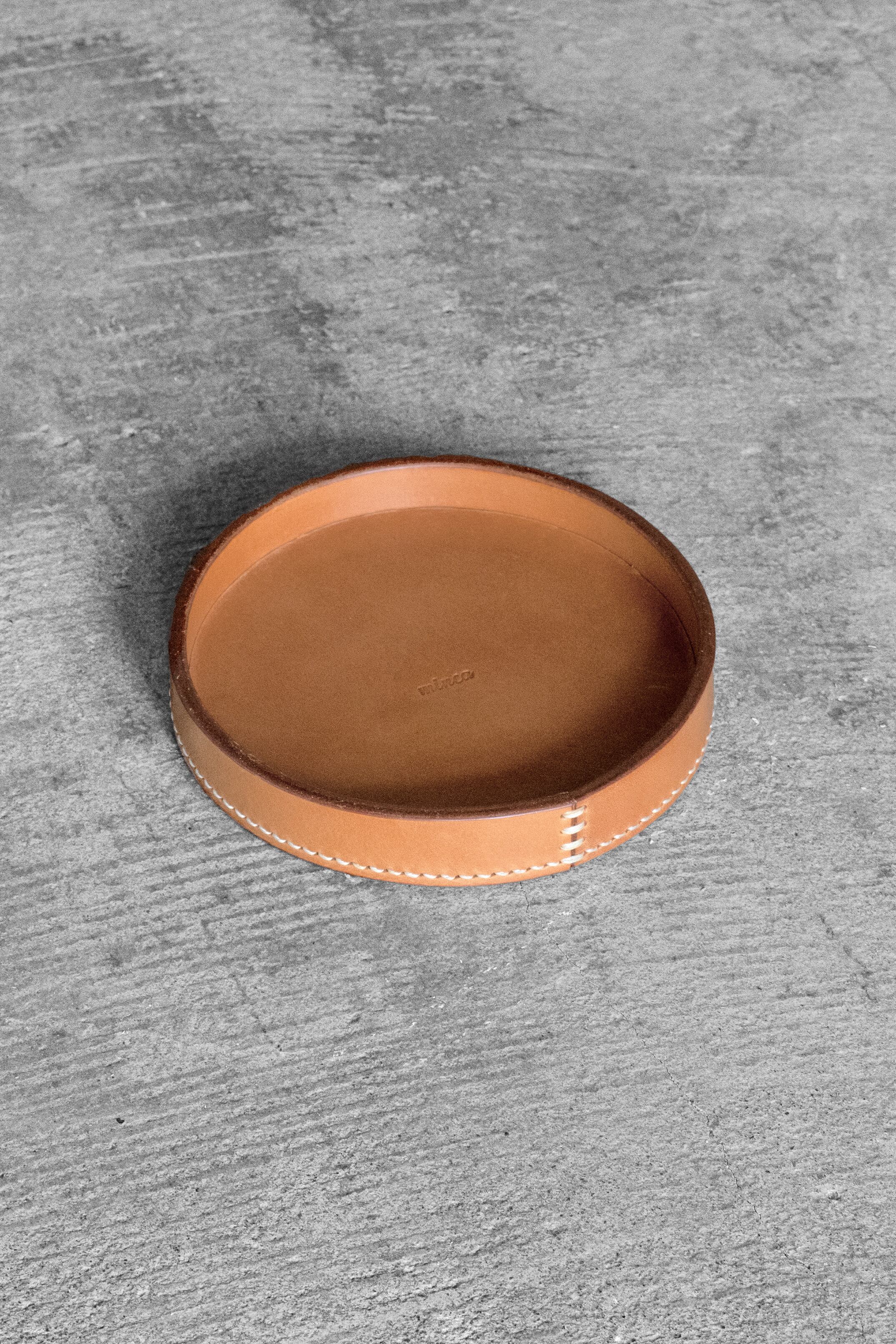 駒縫いという手縫いの技法を施した、オールハンドメイドな円形トレイ。