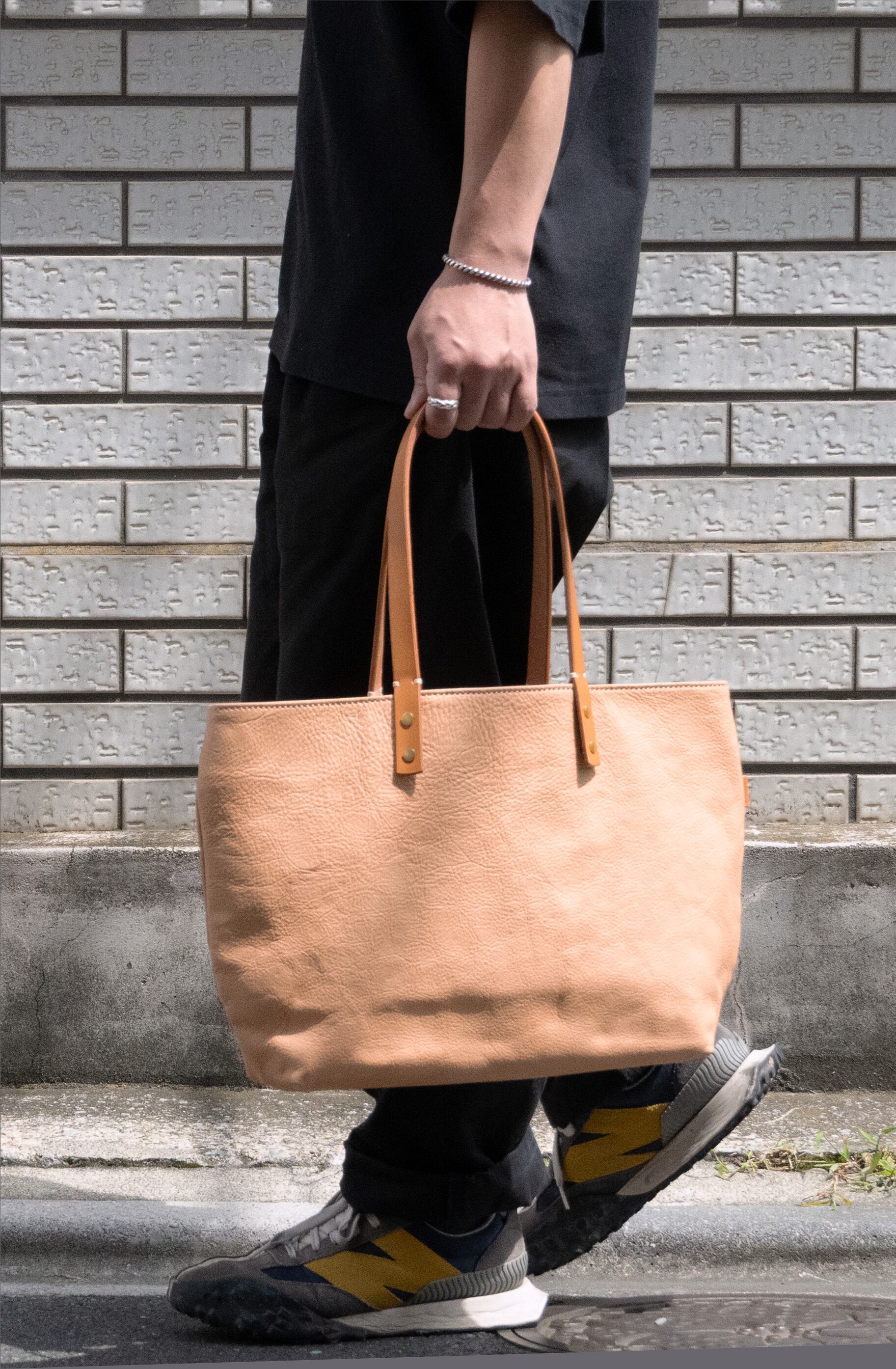 持ち手(別売)には、mincaオリジナルのハーネスレザーを使用。